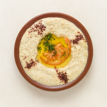 A smoky and smooth eggplant dip, roasted to perfection and blended with tahini, lemon juice, and garlic. Garnished with olive oil and herbs. Ideal for dipping or spreading on warm pita.