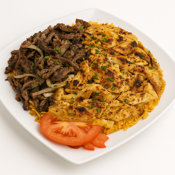 delicious combo of shredded beef shawarma and chicken shawarma for the indecisive foodie. Comes with rice, garden-fresh salad, house sauce, and warm pita bread.