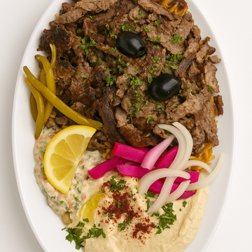 Sliced spiced beef shawarma, juicy and slow-roasted, laid over a bed of seasoned rice. Comes with a fresh chopped salad, tahini or garlic sauce, and fluffy pita bread on the side.