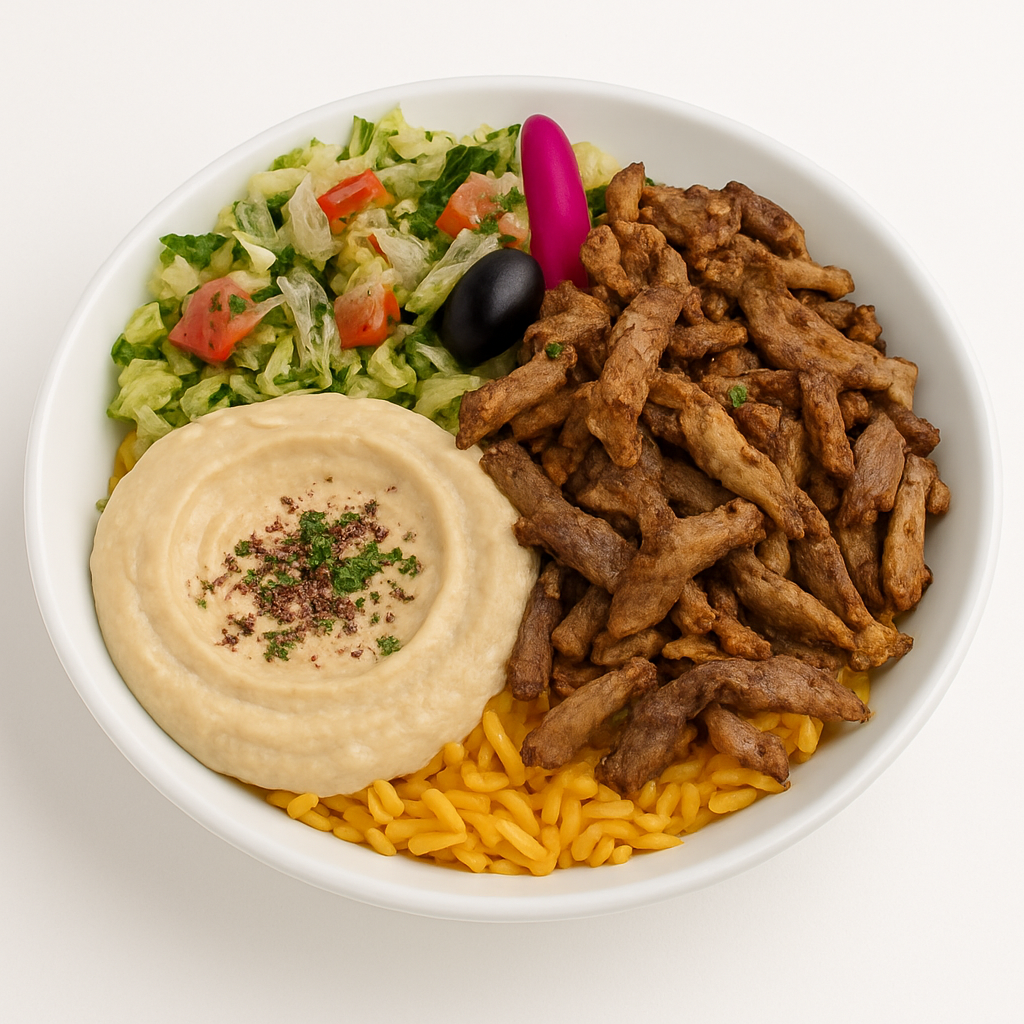 Sliced spiced beef shawarma, juicy and slow-roasted, laid over a bed of seasoned rice. Comes wit...