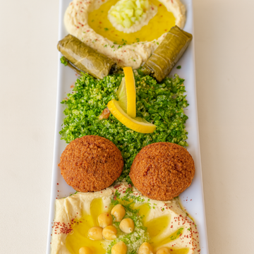 A fresh and flavorful vegetarian sampler! Includes 2 grape leaves, 2 falafel, baba ghanouj, hummus, and a side salad. Great for sharing or enjoying as a full light meal.